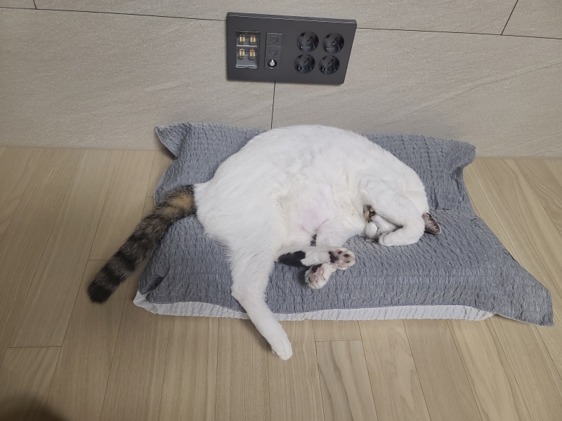 냥이가 하루종일 펫베드 위에서 살아요~ 푹신한 곳 싫어하는 아이라 안올갈까 걱정했는데 너무 좋아합니다. 다음에 한사이즈 더 큰 걸로 사서 사이즈별 침대 만들어주려구요.